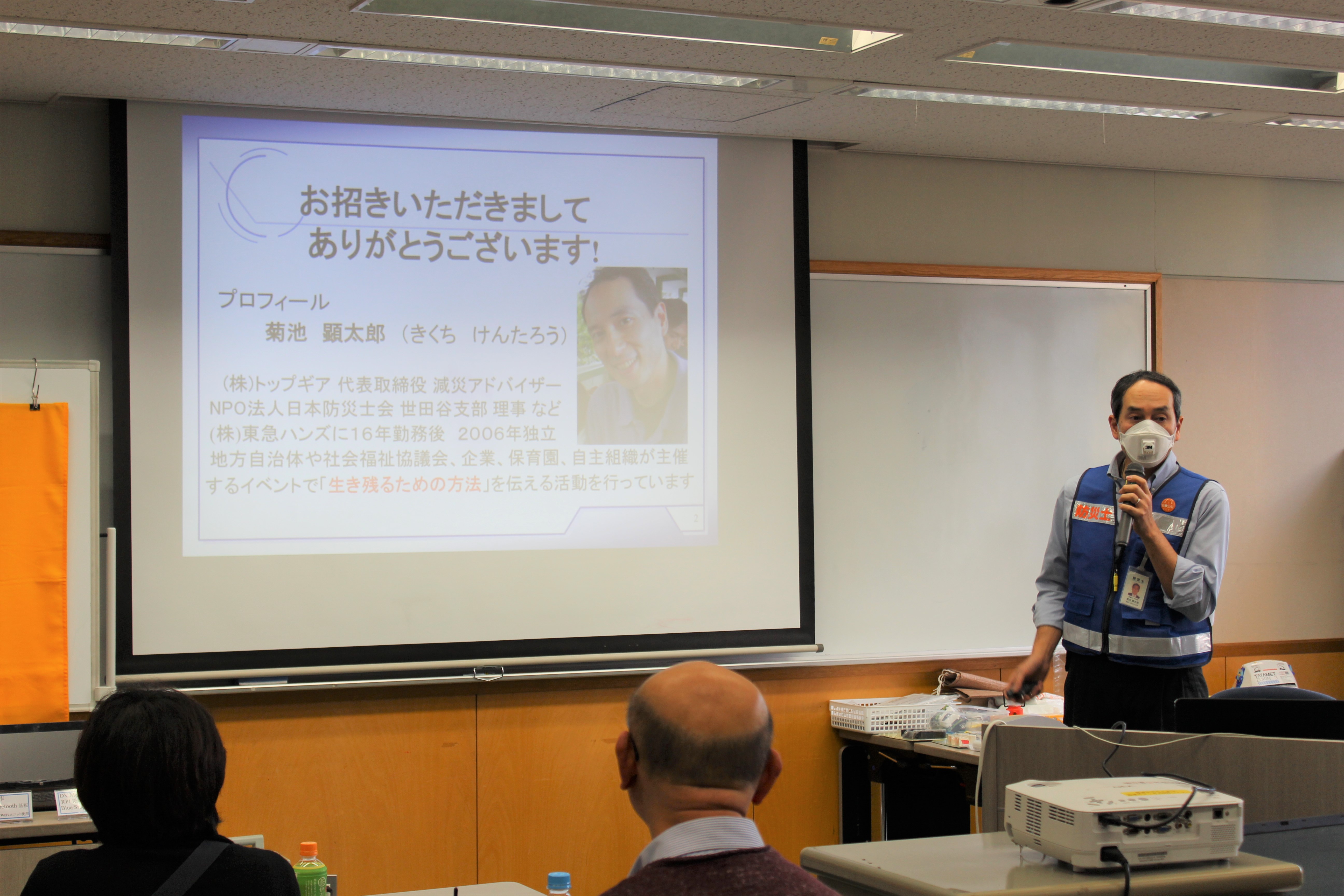 第2部は減災アドバイザーの菊池 顕太朗氏による防災の準備と被災時の対応についての講座。菊池氏は(株)東急ハンズに勤められた間にアイデアグッズを数々ヒットさせた方としても有名です。講座では防災に対する考え方と実際に被災した際に、人はどうなるか・どうするかを深く考えさせられました。
