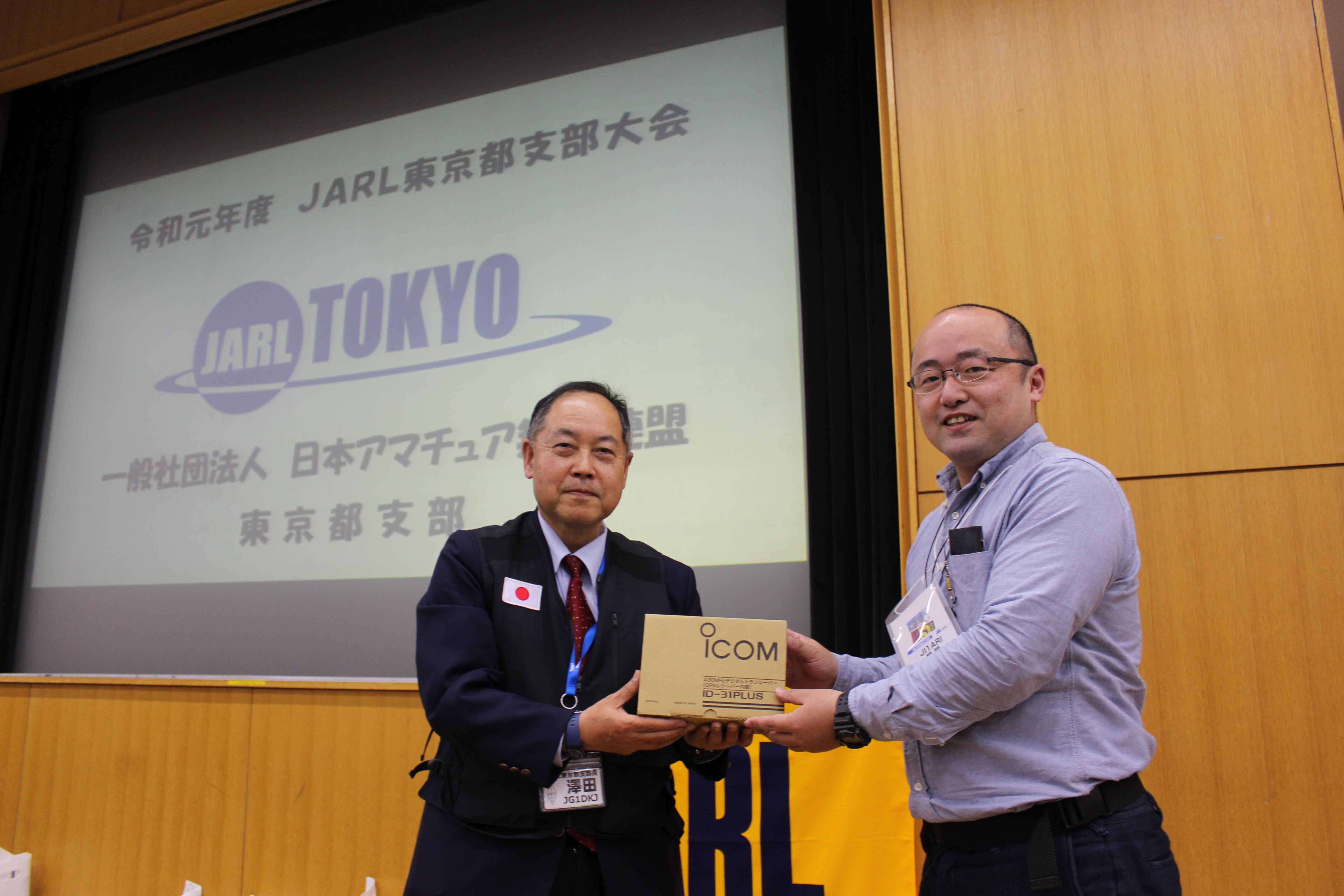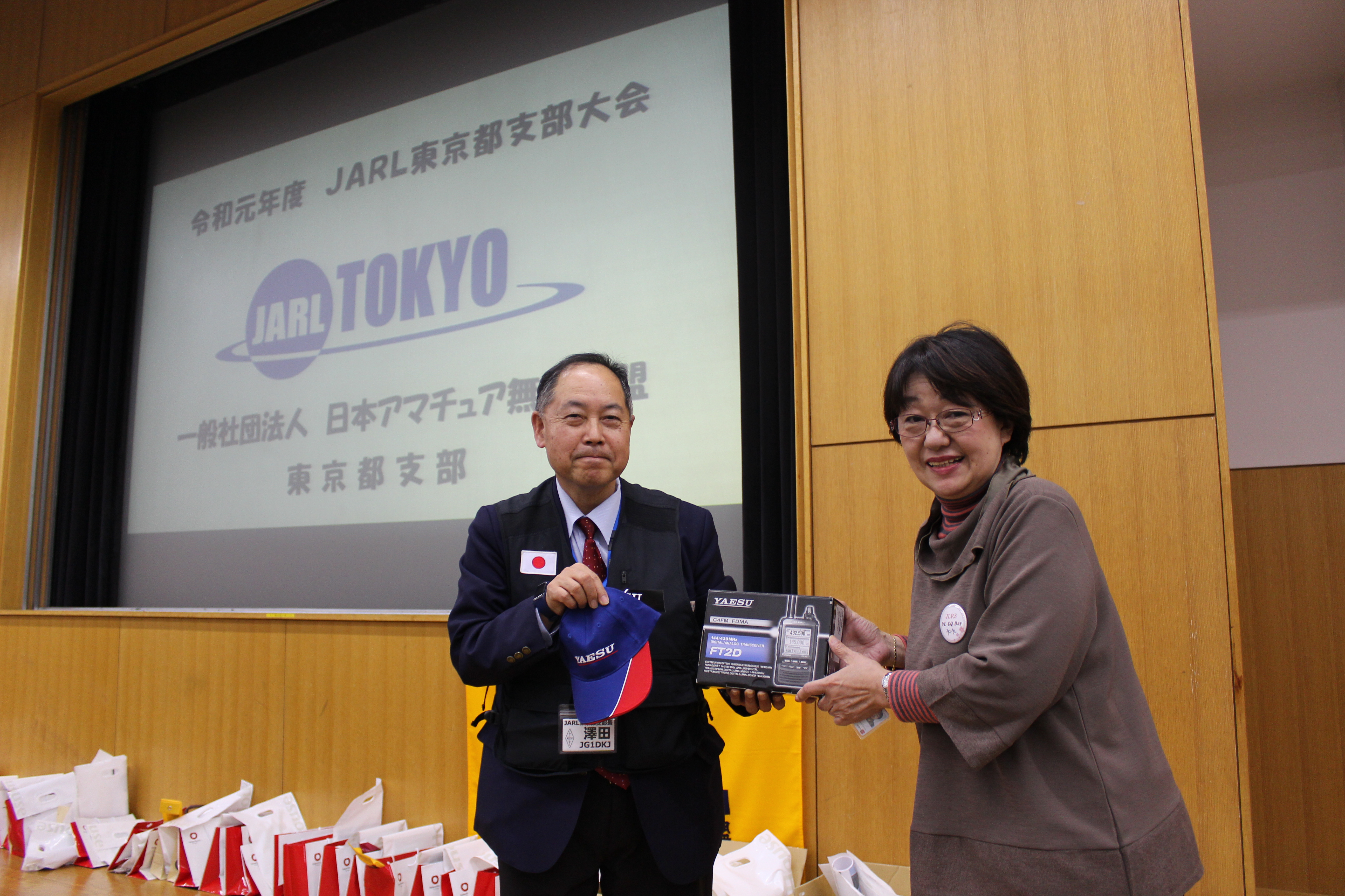 最後に、恒例のお楽しみ抽選会では、目玉景品のハンディ無線機(ID-31Plus・FT2D)がMASACOさんとのじゃんけん大会で争奪戦を行い、それぞれ男性ハムと女性ハムが手にしました。その他各種景品には、岩手県遠野アマチュア無線クラブからいただいたお米などもあり、参加者へもれなく渡され東京都支部大会記念のお土産となりました。