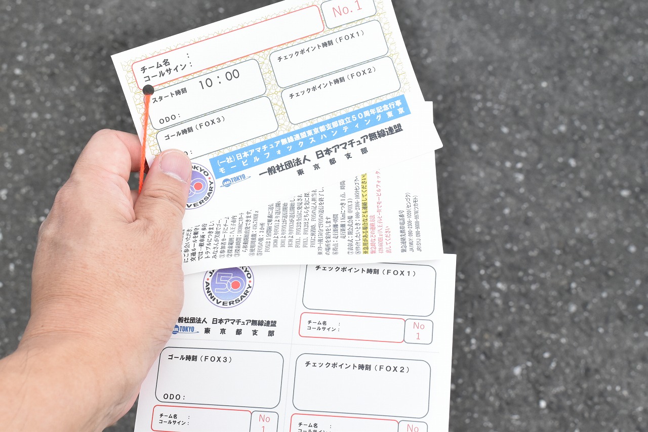 早くから参加する皆さんが集まってきましたので、予定時間を早めて受付を開始しました(受付担当・左写真)。参加者は右の写真のカードを持ってスタートします。ハンターは、3か所に隠れているFOXを探します。FOX1、FOX2はどちらを先に探してもよく、その後にFOX3(ゴール地点)を探します。得点は走行距離(1Km-1ポイント)+時間(1分-1ポイント)で競います。各地点情報はこちらです。ハンターが各FOXに到着した時間はこちらです。 ※到着情報のJN1VPW局のプリフィックスをJP1と誤記入しておりました。 JN1VPW様 お詫び申し上げます。申し訳ありませんでした。