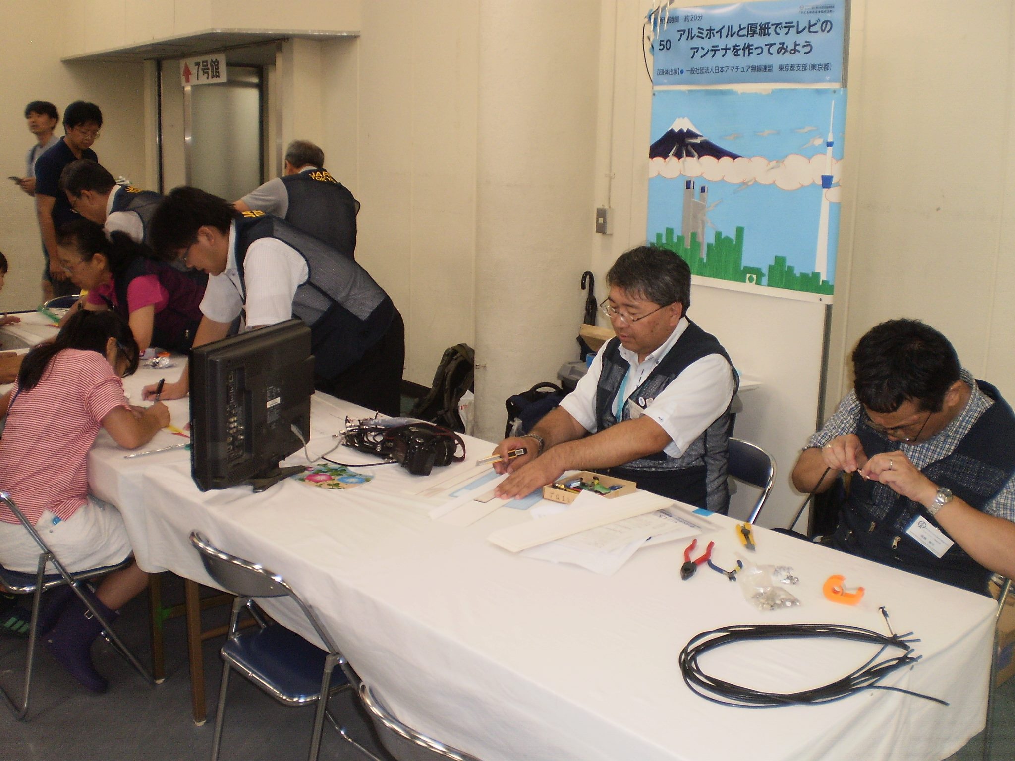 今年は JA1CPA 中村氏が設計・開発された、アマチュア衛星通信の受信用のアンテナ(ハムワールド、CQ出版書籍にそれぞれ関連記事が掲載されております。)をTVの地上デジタル波用に改良し、『自分で作って実際に出来上がったアンテナでTVを受信してみよう』という内容で工作体験コーナーを出展しました。