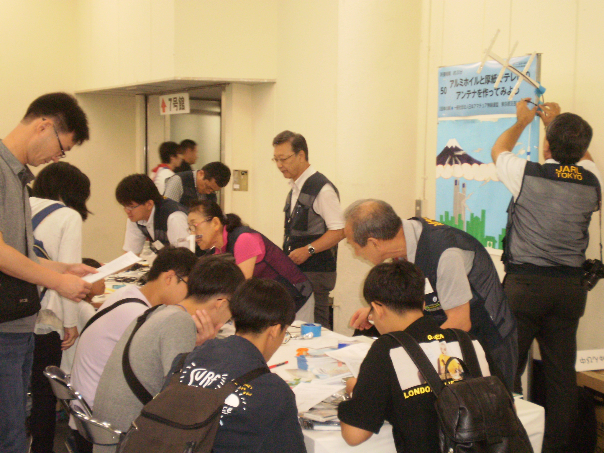 工作教室で作ったアンテナを持ち帰らせる際にアンテナを入れる袋を用意し忘れたのが功を奏したのか(?)会場内を自作したアンテナを持って歩く子供たちが目だったお蔭で、台風が来ていた初日も通り過ぎた翌日もたくさんのこどもたちがJARL東京都支部のブースを訪れてくれました。