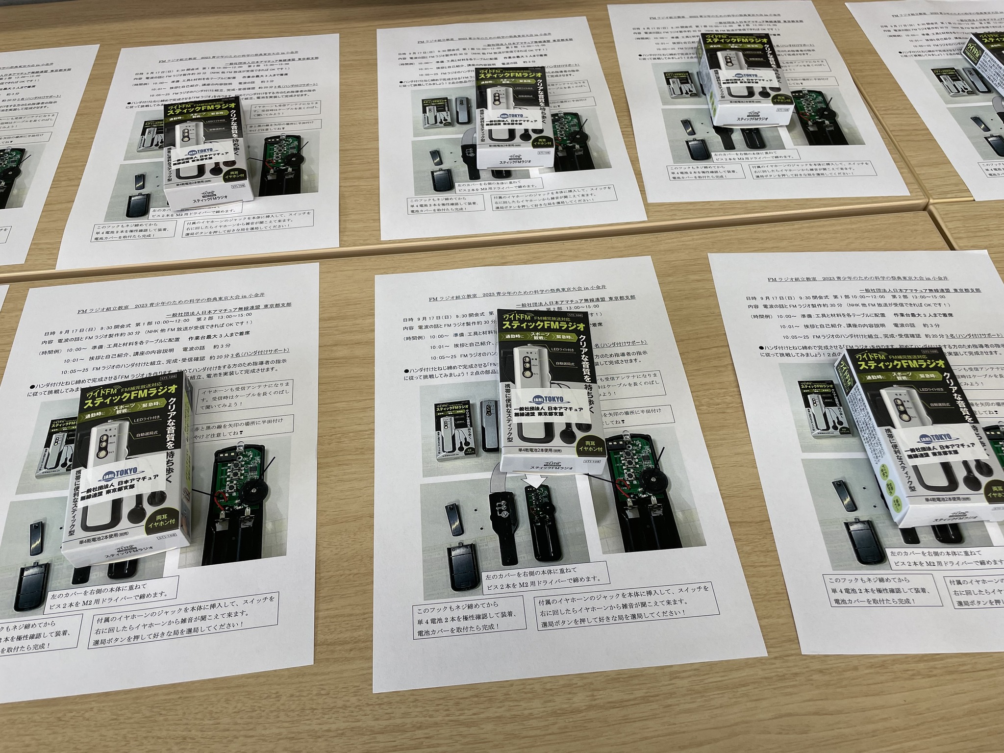 半田こてを使用しますのでやけどをしないように細心の注意を払いながらブースは2名体制で3つのテーブルで同時対応しました。実際に来場するこどもたちに半田付けを指導するのはボランティアの学生で、7名(午前中3名、午後4名)が参加者に製作時の指導をしてくれました。ボランティアの学生は社会学習の一環で参加されておりますので、支部役員と同様に来場者のこどもたちが入場する前の空いた時間を使ってFMラジオの製作をしてもらい、それをもとに参加者の指導をされました。