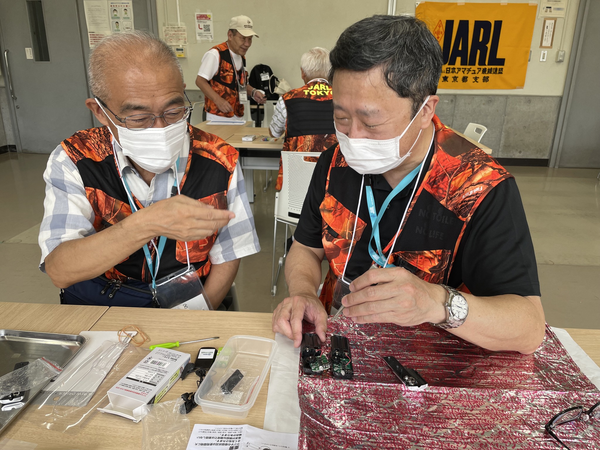 隣のブースでは東京都電波利用推進員協議会の皆様が、ワイヤレスマイクを組立て微弱電波で遊ぼうのテーマで参加されておられました。あちらには当支部監査指導委員を兼任されているかたが複数人ほどいらっしゃいますので、2ブースが協力態勢を敷いたような格好にもなりました。
