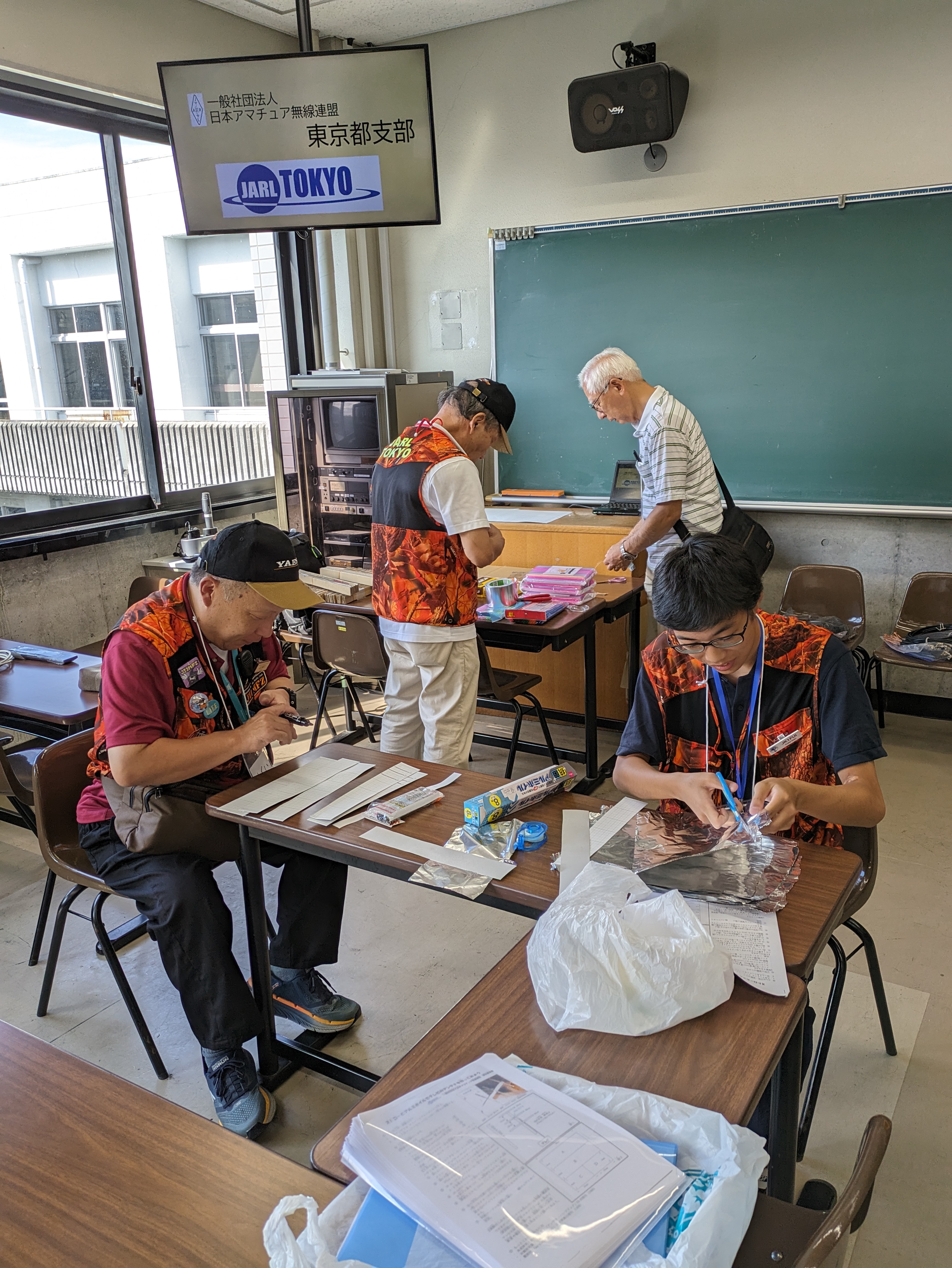 午前中の参加者(製作した子ども)は15名、午後は23名の合計38名が高校生8名による指導でアンテナ工作を行いました。準備時間中に高校生たちも製作しているので、計46本の 地デジ受信用アンテナが今年は製作されました。製作が終わって、最終確認としてTVが映れば完成となります。今年は担当した高校生たちの教え方もよくて、最終確認時に子どもたちが製作した地デジ受信アンテナの手直しを支部役員がすること無く、製作成功率100%を達成しました。アンテナをTVのコネクタに繋ぐ前は「絶対映らないよ」と半信半疑のお子さんの顔がアンテナを繋ぎ、TVが映ったときの笑顔は素晴らしかったです。